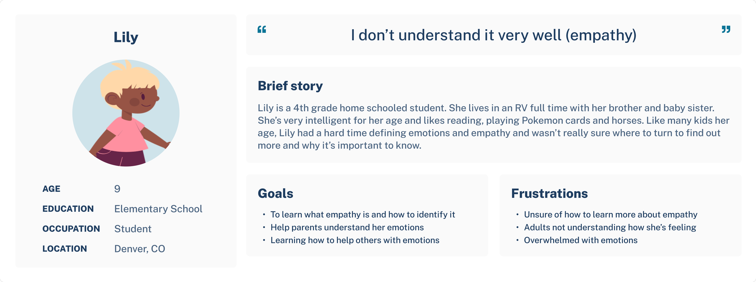 To conduct my research and understand the user I relied on user surveys consisting of kids ages 7-12 years old, that both had siblings and were old children. They all expressed they were unclear what empathy was and were not all sure what emotions were or how to deal with them.